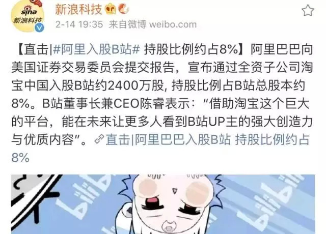 2 月 14 日晚间,阿里巴巴向美国证券交易委员会提交报告,宣布通过全资子公司淘宝中国入股哔哩哔哩(以下简称B站)近 2400 万股, 持股比例占B站总股本约8%。