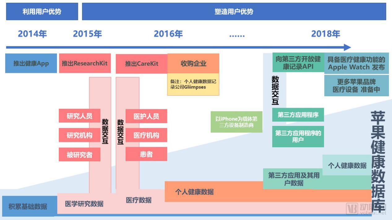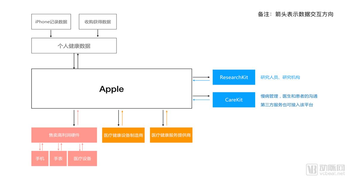 如下图,“苹果公司模式”是利用用户优势积累数据——推出ResearchKit和CareKit功能网罗医学研究及医护相关者,同时获得更多专业数据——网罗第三方软、硬件供应商——构建生态系统——反过来再通过服务能力网罗和留住用户——形成生态系统闭环。