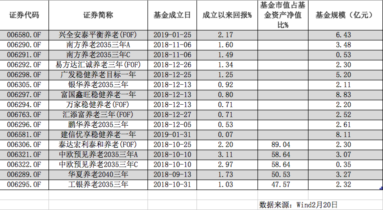 根据Wind数据统计,目前已成立的养老目标基金共有14只(不同份额合并计算)。截至2月20日,所有基金均已建仓,并全部取得正收益,收益率大多低于3%。最高的是中欧预见养老2035 (006321)收益超3%,今年1月底刚刚成立的建信优享稳健养老一年(006581)也有0.07%的增长率。