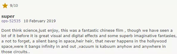 网友BasicLogic认为《流浪地球》“是一部天真又可笑的中国科幻半成品”;而网友ops-52535写道“别想太多科学,享受就好,这是一部好看的中国电影”。