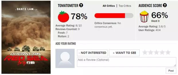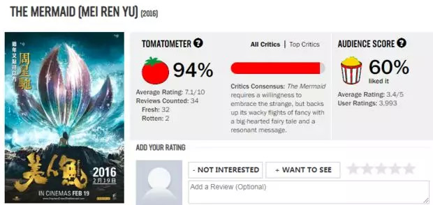 烂番茄网站上,2016年的《美人鱼》媒体评价新鲜度94%,2017年的《功夫瑜伽》媒体评价新鲜度50%,《西游伏妖篇》媒体评价新鲜度58%,2018年的《红海行动》媒体评价新鲜度78%,《唐人街探案2》媒体评价新鲜度54%,《捉妖记2》媒体评价新鲜度56%。