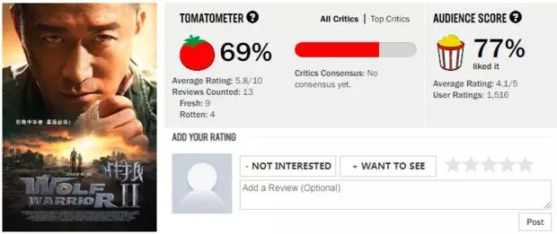 比如同样是北京文化出品的电影《战狼2》就有烂番茄媒体新鲜度69%的反馈,该片由H Collective(《极限特工》系列制作公司)负责北美发行。