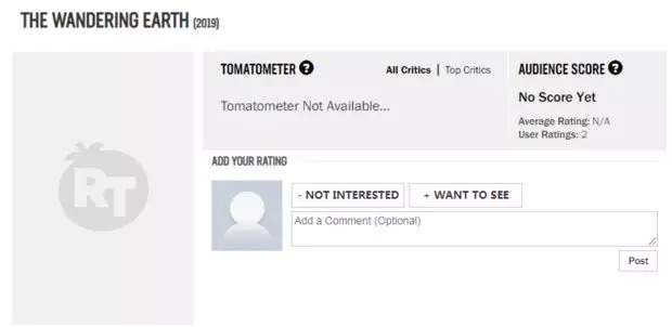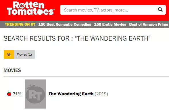 截止发稿时,我们在烂番茄网站搜索《流浪地球》片名虽然出现了71%新鲜度的数据,但点进电影主页却无分数显示。