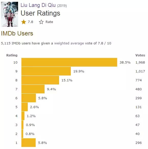 同时,《流浪地球》的1分(最低分)率也比这两部电影更高,《流浪地球》的IMDb评分当中,1分占比5.8%,《阿凡达》的1分率为2.5%,《地心引力》打1分的观众只有1.9%。