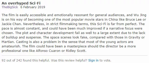TheBigSick6觉得影片“配不上热度。对普通观众来说很好理解,也很容易有情感共鸣。但从电影制作方面来评价,这部科幻片远远不够好。”