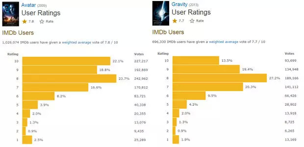有意思的是,在IMDb网站上给《流浪地球》评分的用户当中,给出满分10分的比例高达38.5%,甩出这两部电影不止一条街。《阿凡达》的满分率只有22.1%,给《地心引力》评10分的用户只占13.5%。