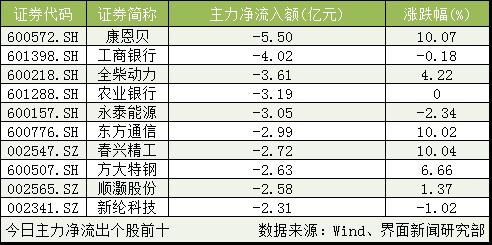 43只个股主力净流出额超过1亿元。康恩贝(600572.SH)连续两个交易日涨停,今日实现主力净流出5.50亿元,位列两市第一。妖股东方通信(600776.SH)在10个交易日内夺下9个涨停板,今日有2.99亿元主力资金已套现离场。