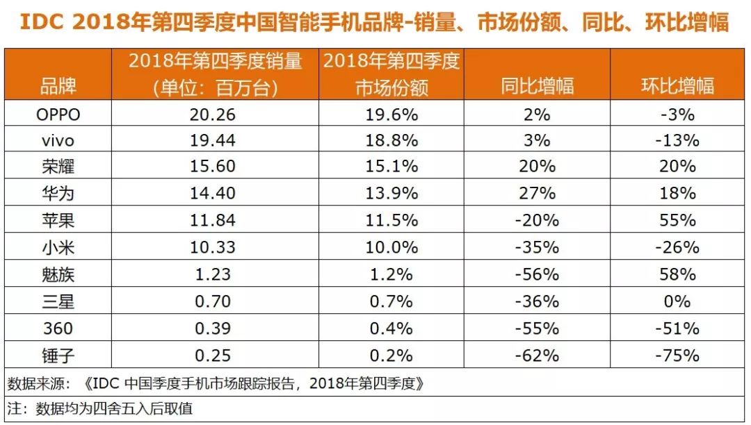 千呼万唤的小米9终于露面了,不断加快新品迭代的雷军压力山大,去年2月他曾许愿:10个季度重返国内第一,然而现实并不乐观。IDC最近公布的数据显示,小米Q4销量环比下滑26%,同比剧降35%,市占率从2017年的8.9%跌回7.3%,几乎回吐了年初逆势增长的全部红利。预感到危机的雷军将电视业务的功臣王川调任中国区总裁,制定了更具体的目标:2019年成为国内第一、全球第三,出货量1.8亿部。