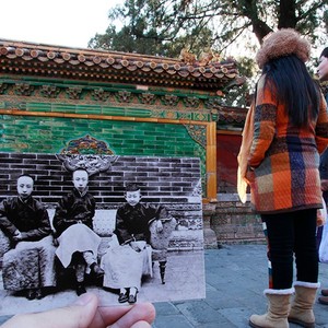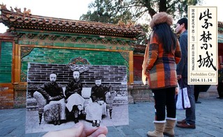 馆藏策划人员便梳理每张照片的时间地点人物,从近四万张老照片藏品中遴选120张,将时下流行的“穿越”与现状实景相结合。照片虽已过百年,却依然能从西洋镜里回望末代皇朝的众生相,历历在目却又恍如隔世。让人不由感慨“雕栏玉砌应犹在,只是朱颜改”。