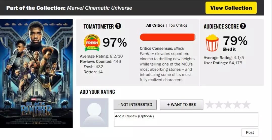 在口碑方面,该片却创造了截然不同的两种反应。在影评网站IMDb,《黑豹》的均分目前仍高达7.4(满分10分),这个数字也让它成功跻身到以《银河护卫队》、《复仇者联盟》、《雷神3》、《钢铁侠》、《美国队长2》和《美国队长3》等为代表的漫威口碑电影第一梯队。在综合评分网站烂番茄,该片的新鲜度高达97%,均分8.2分。在专业影评网站Metacritic,《黑豹》均分则高达88分,不仅是漫威系列电影中目前得分最高的一部,甚至遥遥领先于其他作品。与之形成鲜明对比的,是豆瓣上6.5的均分,以及过一半的3星评价。