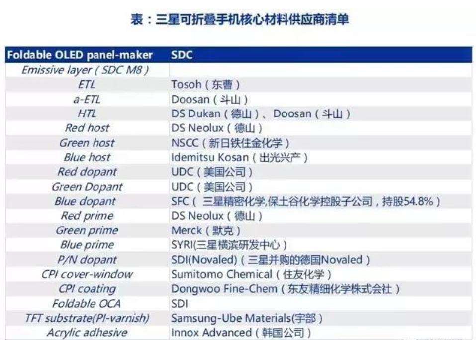 首先是偏光片。以三星的产品为例,其屏幕Infinity Flex显示屏中的偏光片的厚度相比于以往降低了45%。而目前具备高端超薄偏光片生产能力的主要为日本日东电工(Nitto Denko)和住友化学(Sumitomo),产能有限。