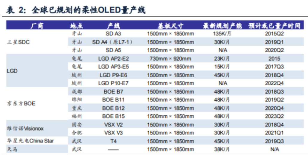 目前全球能生产柔性OLED产线的公司并不多,包括了韩国公司三星、LG,中国公司京东方、维信诺、华星光电和天马。其量产时间基本都在2018年到2023年之间。