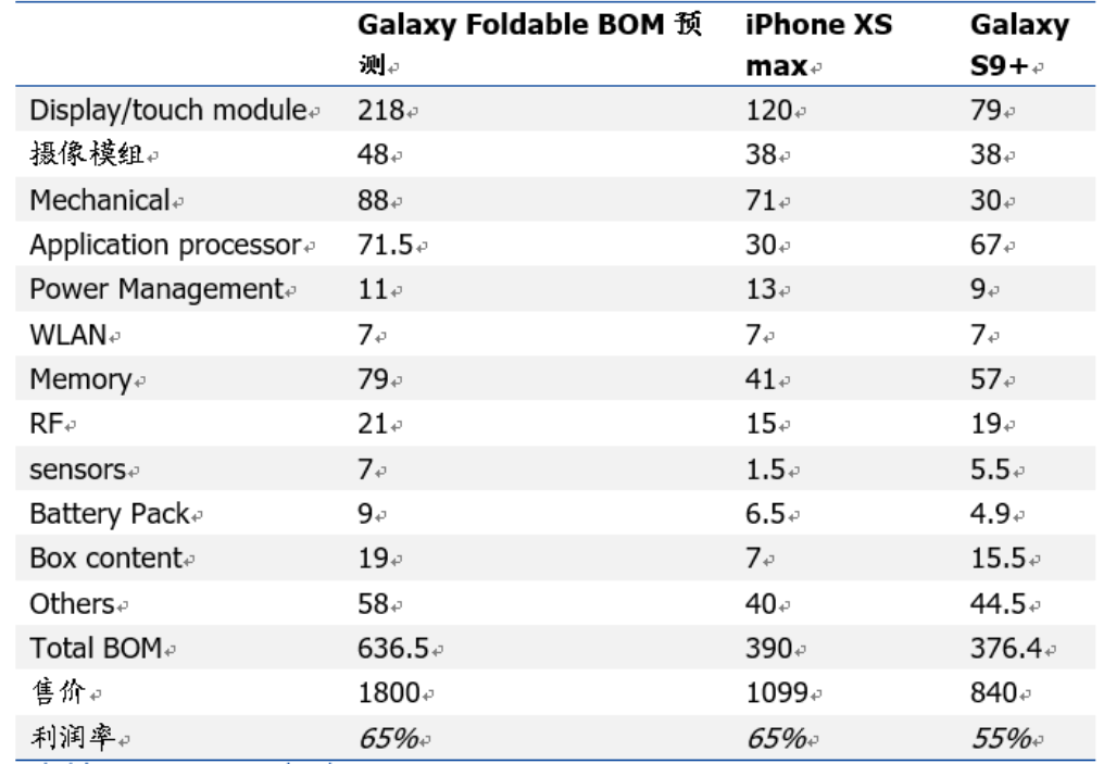 以三星的可折叠屏手机为例,其元器件成本要比iPhone XS高出约65%,其成本增加项主要为屏幕模组和铰链元器件。