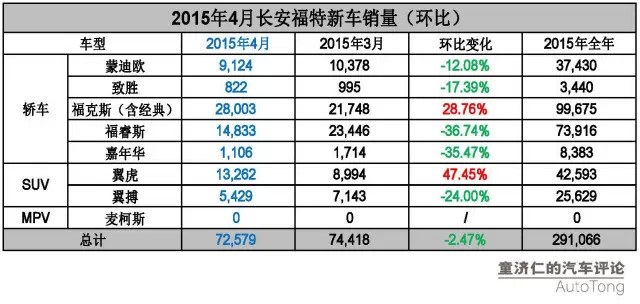 2015年4月,长安福特销售新车72,579辆,同比增长6.55%,环比下跌2.47%,本年度单月销量首次超越东风日产,排名国内乘用车企销量第五名。但从2015年1-4月的累计销量来看,长安福特仍然落后东风日产近25,000辆,排名第六。