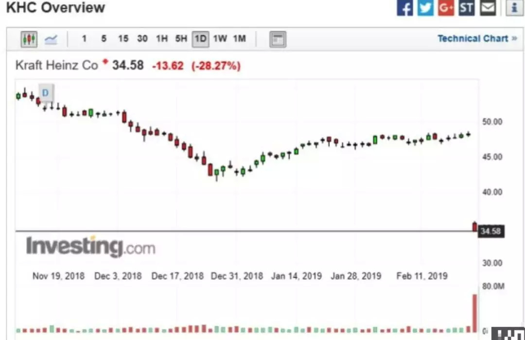 受上述因素和该公司的大量其他负面消息的影响,当地时间周五开盘后不久,卡夫亨氏股市暴跌27%以上,刷新纪录低点,市值蒸发逾160亿美元。
