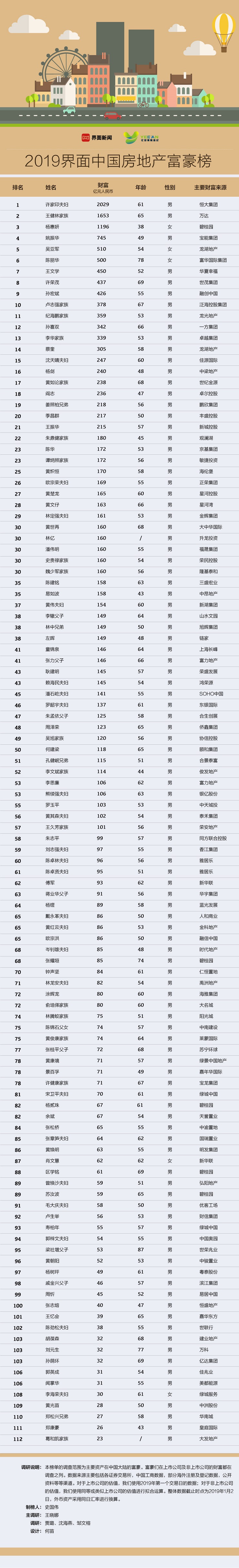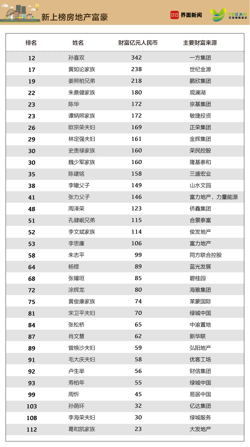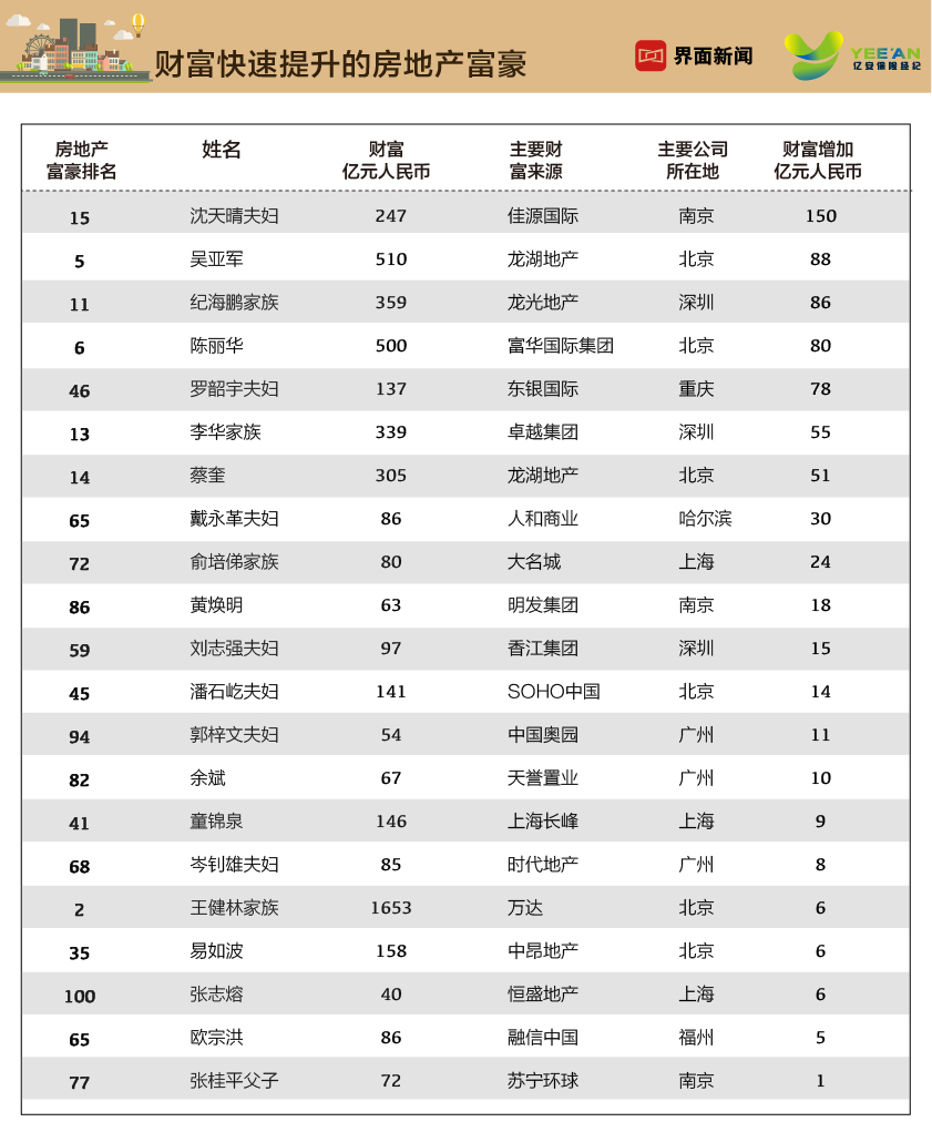 界面联合亿安保险经纪第二次推出《2019中国房地产富豪榜》,它是《2019界面中国最富1000人》榜单的子榜单。