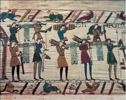 贝尤挂毯上的这幅场景,刻画了诺曼人将剑和整套盔甲搬上船的画面。这条刻画诺曼人征服英格兰历史的挂毯,约长70 米,其上面共有79 幅叙事场景。