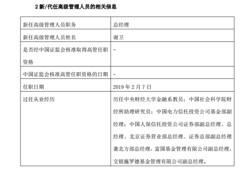 2月28日,交银施罗德基金发布高管变更公告,宣布原总经理阮红转任公司董事长,原副总经理谢卫出任公司总经理,任职日期2月7日。此前的2018年10月,公司原董事长(法定代表人)于亚利因达法定退休年龄已经离任。