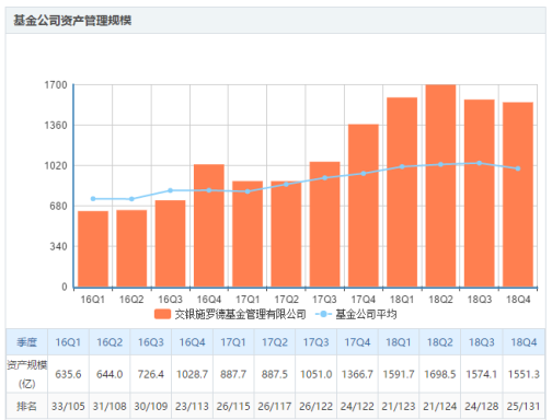 在人事动荡下,交银施罗德的发展受到了不小的冲击。据同花顺iFinD数据统计,截至2018年末,交银施罗德基金旗下共有79只基金,公募资产规模合计1551.3亿元,在131家公募基金公司中排名第25位。而同期成立的工银瑞信、建信基金两家银行系公募的资管规模已经达到了6068.79亿元、6339.48亿元,远超交银施罗德。