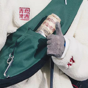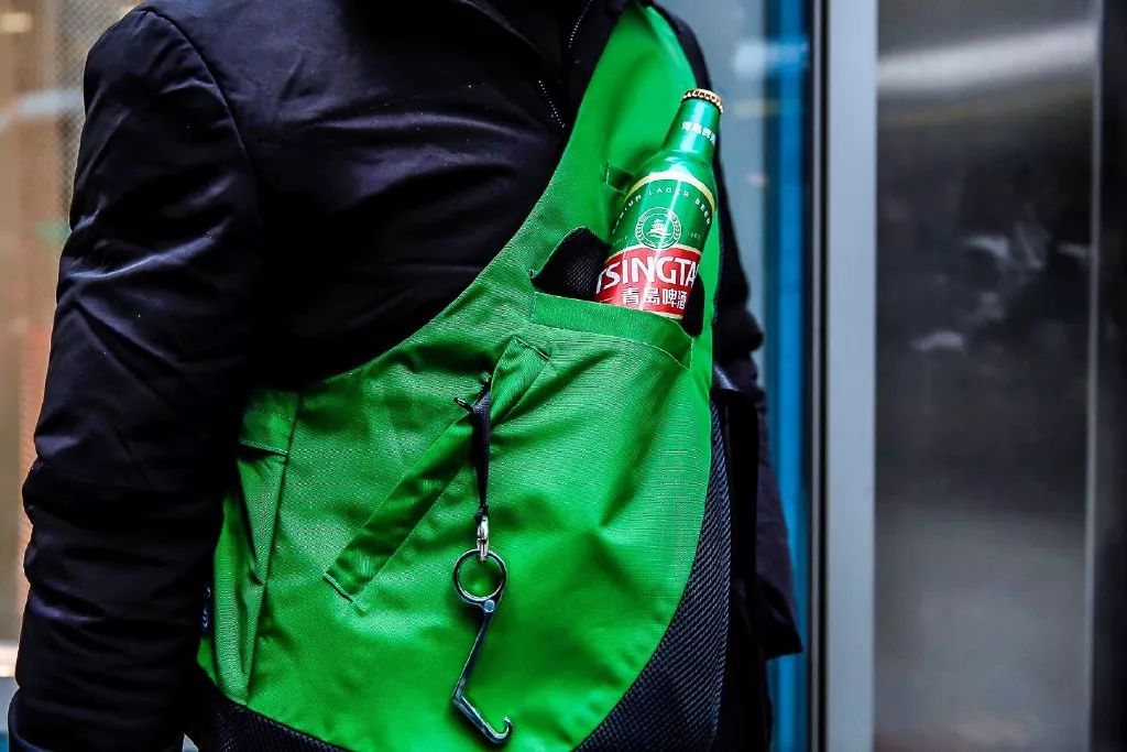 当然,只在衣服上印上标语只能算是联名设计中的基本动作,这次青岛啤酒的联名里比较有意思的地方在于,这两件衣服都搭配了能把啤酒穿在身上的斜跨腰包,而腰包的拉链还可以直接当瓶起子,让你“随身随地带啤酒,走着走着就能开”,实现了设计感和实用性的高度结合。
