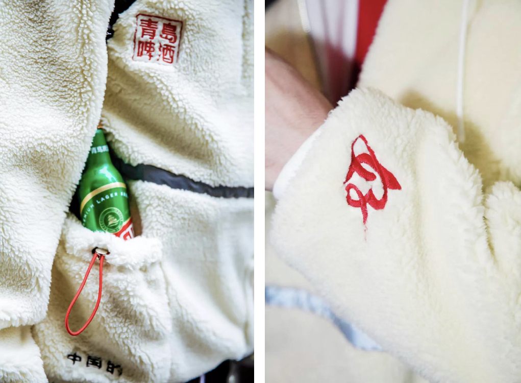 比如说这个白色的羊羔绒卫衣吧,品牌联名的文化风格反正不会少。在服装设计上,白色羊羔绒潮服的右胸上刺着「青岛啤酒」的 logo,左手袖口刺绣的「好」字,和右手袖口刺绣的数字「 1903 」,取材于 116 年前青岛啤酒瓶身上的广告标语。