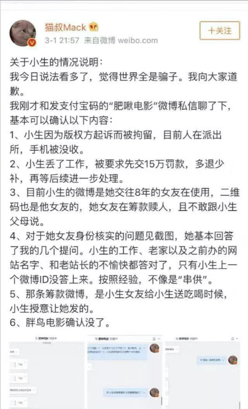 上周,社交网站上传出电影资源网站“胖鸟电影”站长小生被拘留的消息。微博大V、认证为影评人的“猫叔Mack”随后发布微博,证明小生被拘留事件属实。猫叔Mack在微博中称,小生是因为版权方起诉被拘留,小生女友不敢告知小生父母,正在筹集15万元罚款。中国影迷喜爱的胖鸟电影网站也已确认被关停。3月2日,小生本人发布微博,称:“对不起,我确实犯法了,侵犯了著作权,我自己深知自己的错误,已经主动承认自己的违法行为。非常谢谢大家的帮助。”至于小生究竟侵犯了哪家公司的版权,目前尚不明确。