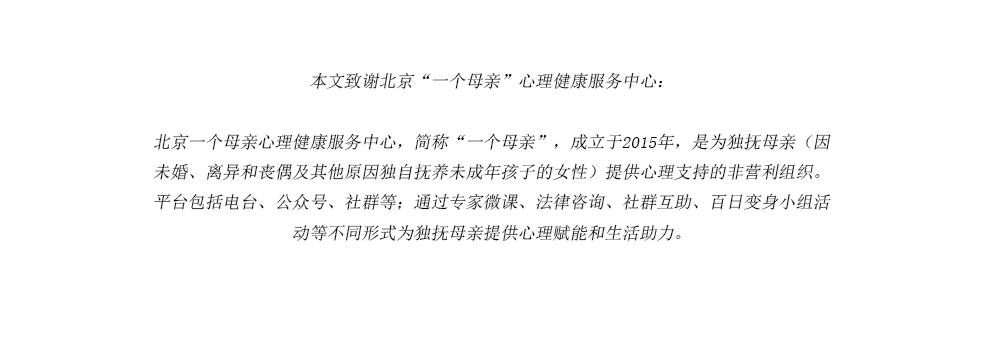 “其实很多单身母亲更多是觉得自己背负了孩子的部分,觉得孩子可怜。我自己就觉得和丈夫分开其实并没有什么。很多单亲妈妈的痛苦是觉得小孩子会受怎样的影响,但其实小孩子没有经历过爸妈(分开)的那个阶段,被抛弃的那种感觉可能是母亲自己的,不是孩子的。”由最初担心照顾不好女儿,到如今一个人在北京工作,甚至闲下来心里有所愧疚而去做兼职,李菲用了三、四年的时间,终于从当时的那场让她后悔的婚姻中慢慢走出。凭借这一点,在她碰到的许多离婚母亲中,她或许可以算是幸运的一个。