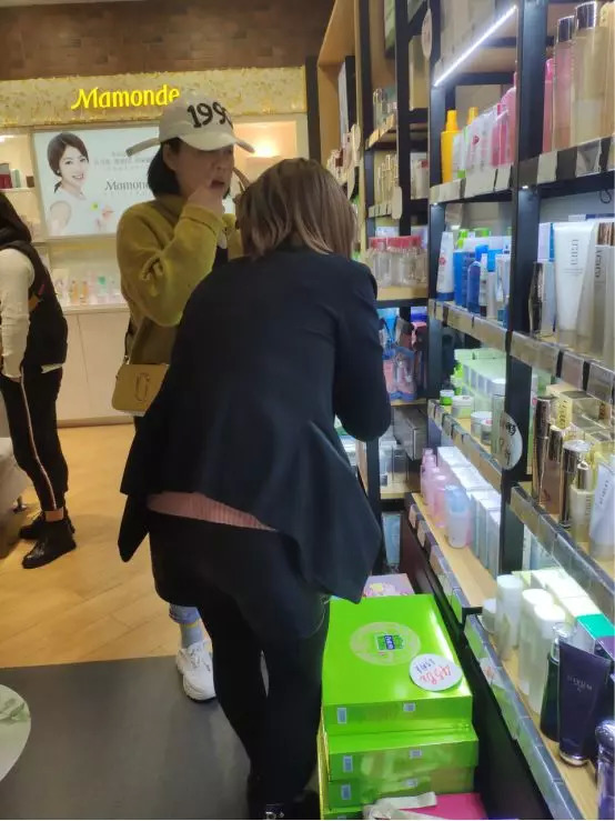 ▍洁美日化店内顾客在美导的帮助下选购产品