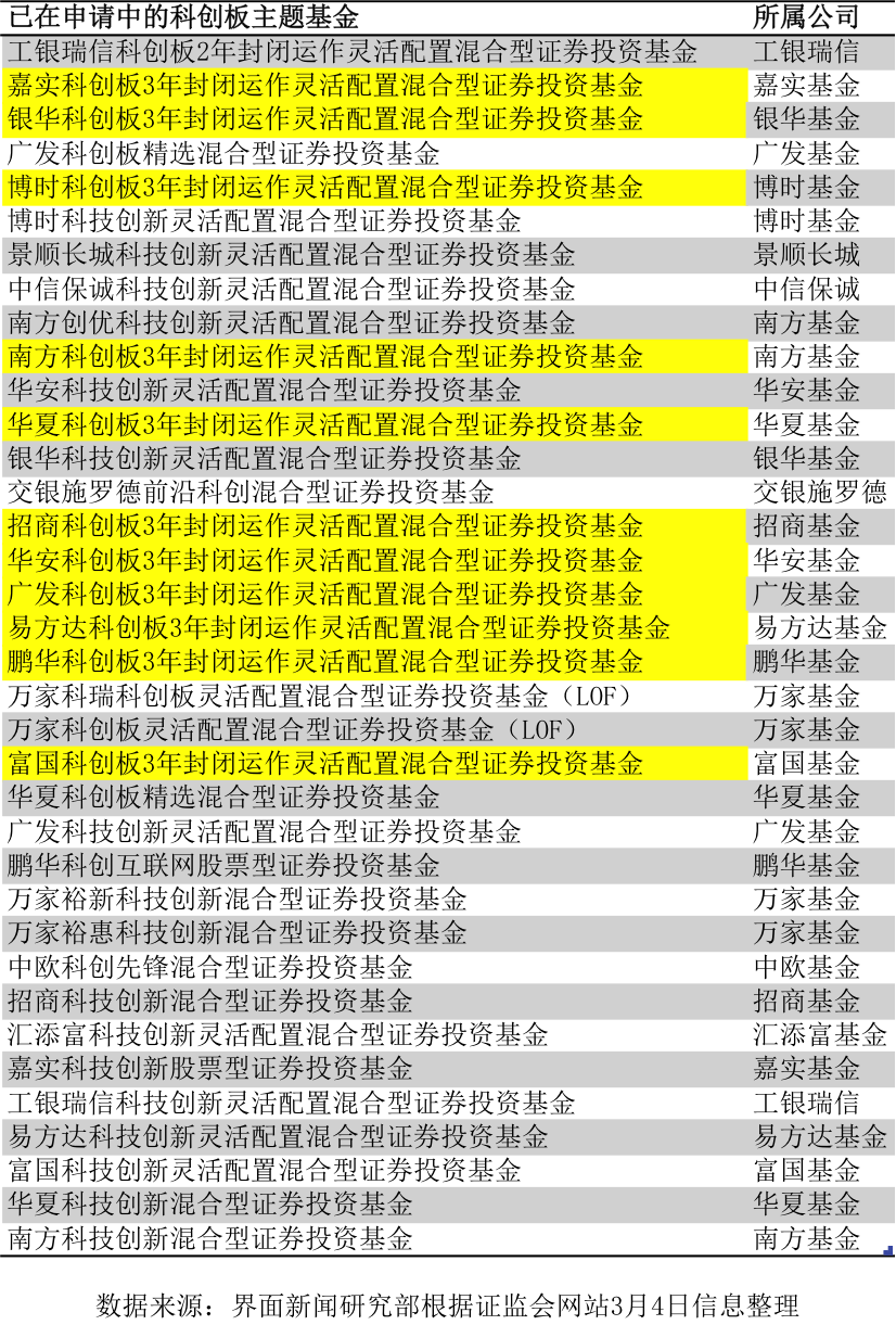 日前,科创板全套规则已完整发布。与此同时,一批以“科创板”为主题的基金正在紧锣密鼓地申报当中。截至3月4日,已有36只公募基金产品上报,19家基金公司参与其中。界面新闻整理如下: