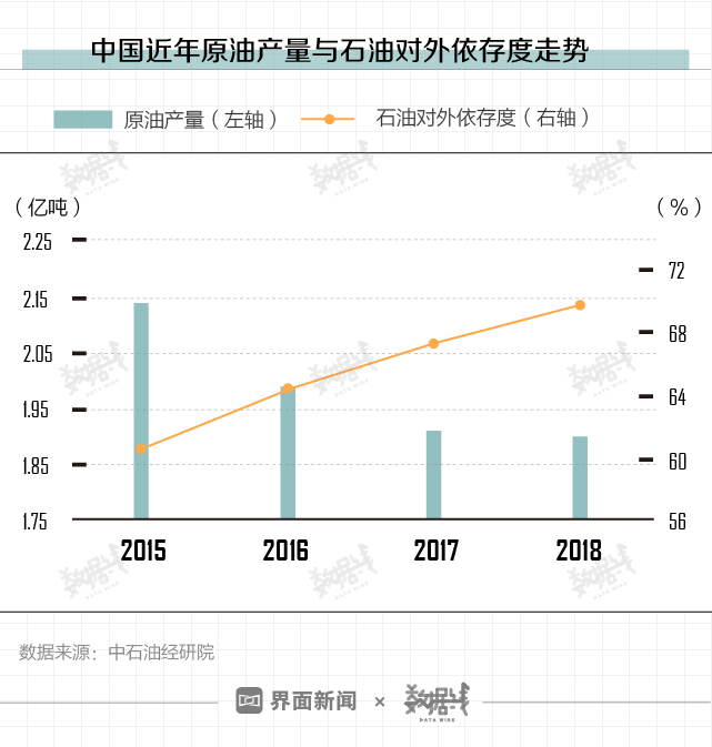 2016年,成为中国原油产量的重要分水岭。从这年起,国内原油产量逐年下滑。与此同时,中国石油对外依存度不断攀升。