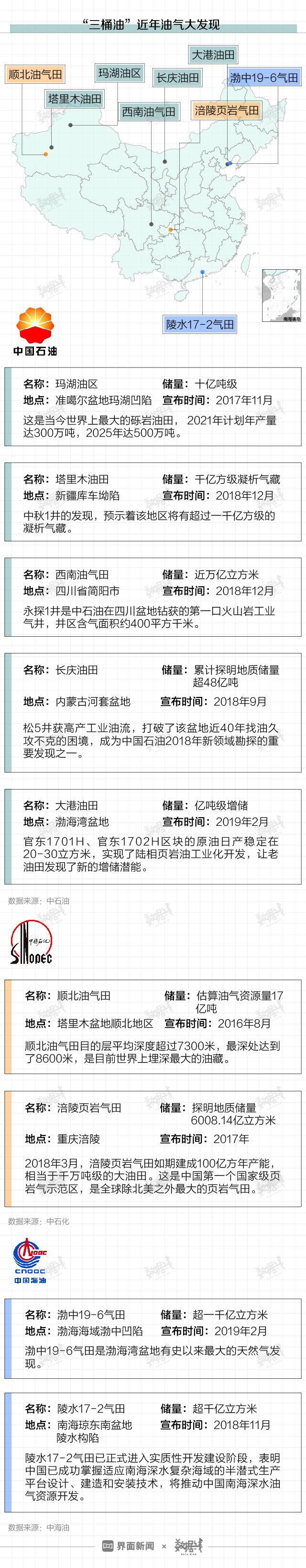 自2016年起,国内“三桶油”相继获得重大油气勘探发现。尤其是2018年以来,相关消息更加密集发布。例如,中石油在塔里木油田发现千亿大气藏,中海油在渤海获千亿方天然气田等。
