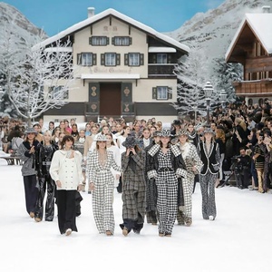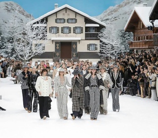 人们只猜对了一半。以往的缪斯来了,比如Claudia Schiffer这位曾代言Chanel超过五个季度的超模,但她选择在台下观秀;充满Karl Lagerfeld标志性的秀场布置也没落下,布置宏大而细腻的滑雪度假胜地延续了他对整体视觉效果的苛求。