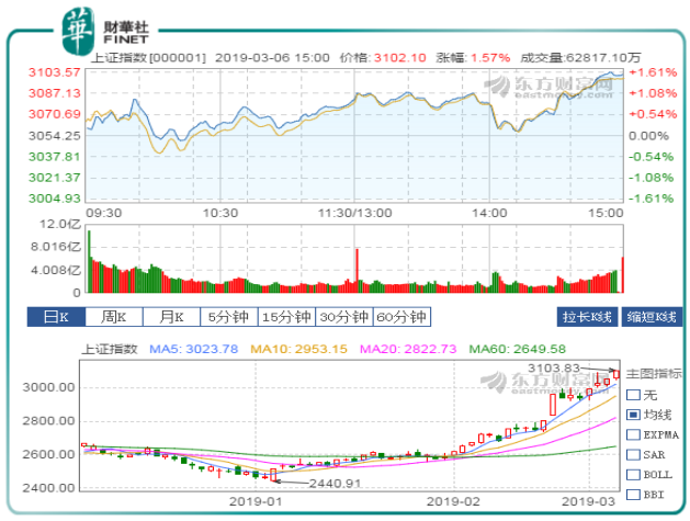 截止收盘,沪指收报3102.10点,涨1.57%,成交额4855亿;深成指收报9700.49点,涨1.09%,成交额6208亿;创业板收报1700.50点,涨1.43%,成交额1850亿;