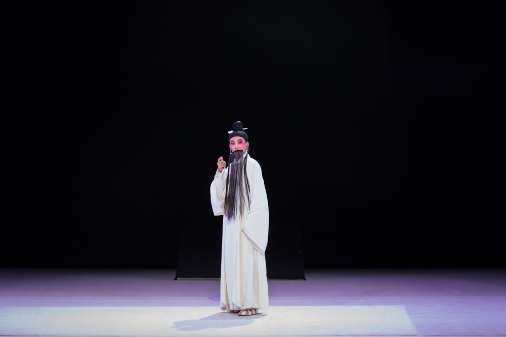 剧场灯灭,台上灯亮,陈仲子穿着一袭白衣出场。他和妻子拜别家人,一步步走向边缘。