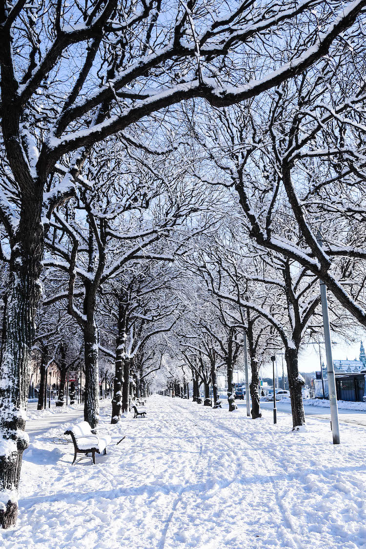 从机场到酒店的路上,除了厚重的积雪,让人无法忽略的是路边大片的树木 —— 在接下来的几天里,这些高挺、纤细的北欧树木始终是城市里不可或缺的景致,在极夜墨蓝色的天空之下以奇异的姿态伸向远处。