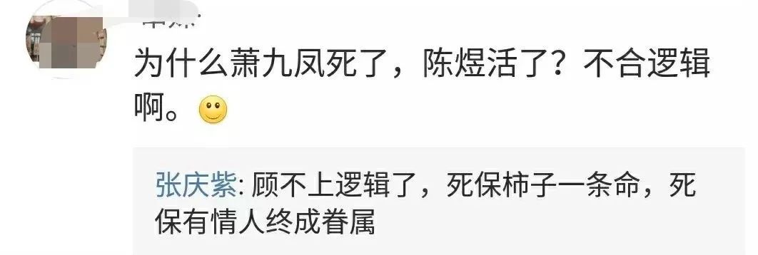有网友在微博上提问该剧的总制片人,“为什么萧九凤死了,陈煜活了?不合逻辑啊”,没想到,总制片人张庆紫竟然回复,“顾不上逻辑了,死保柿子一条命,死保有情人终成眷属”。