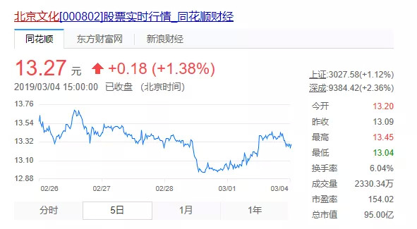 不过,正当上证综指以及创业板指数连续多天向上猛冲的同时,先后成功投资《战狼2》《我不是药神》以及《流浪地球》的北京文化,除了春节后的一两天有上涨之外,自2月末至今竟然不涨反跌,截至两周以来还跌了0.67%,远不如整个大盘的表现。