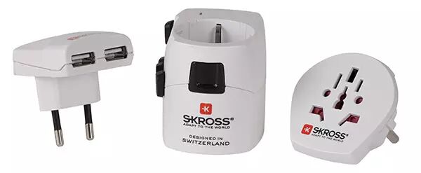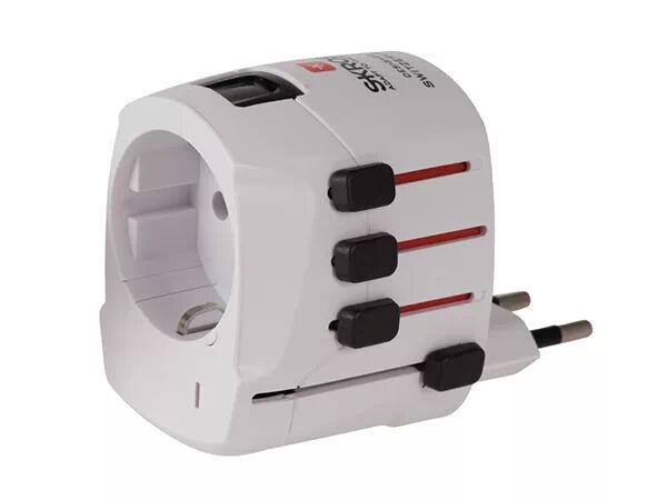 瑞士 skross 公司设计的这款像瑞士军刀一样精致的转换插座支持150 个以上国家和地区插座形状,采用最先进的阻燃材料和合金制成,支持所有携带式民用电器,最大功率可达 2500 W。