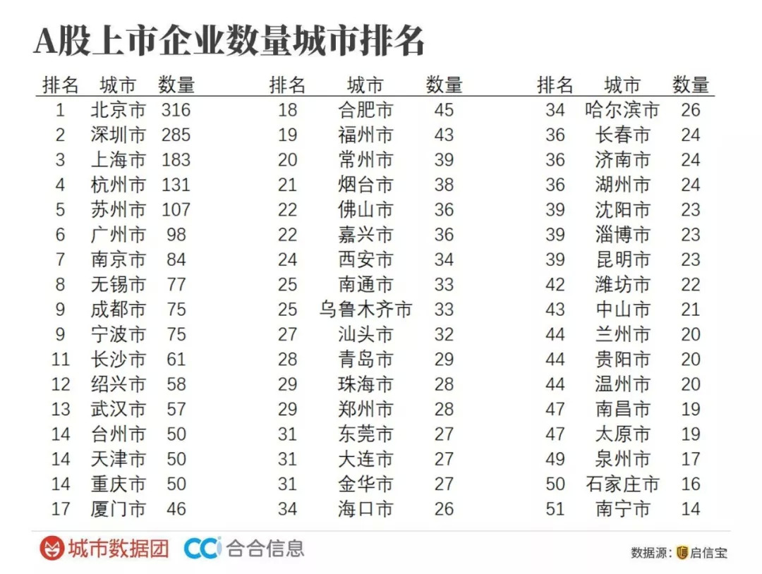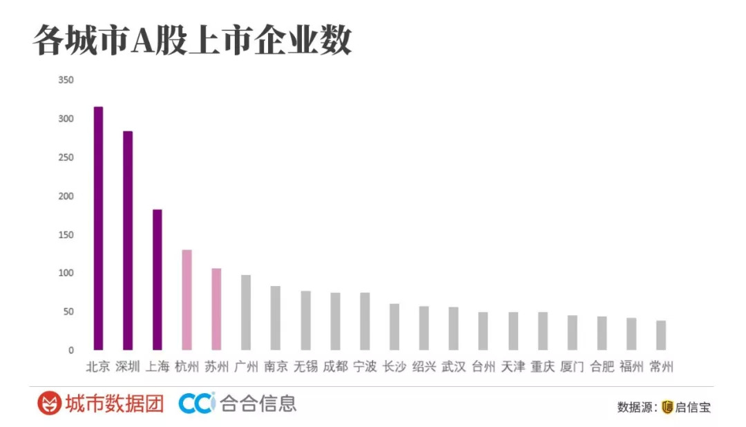 数据显示,A股上市企业数量城市排名中,北京以316家高居榜首,其次是深圳,拥有285家A股上市企业,上海则以183家的数量位列第三;其余入榜前十的城市名单为杭州、苏州、广州、南京、无锡、成都、宁波;中部地区的长沙挤入第11名。