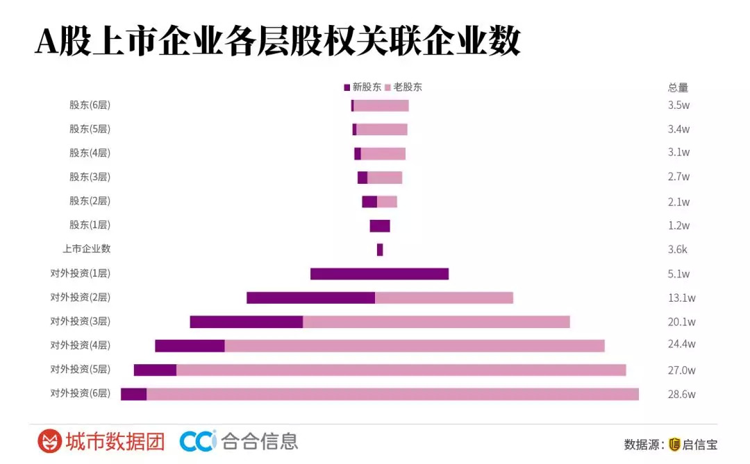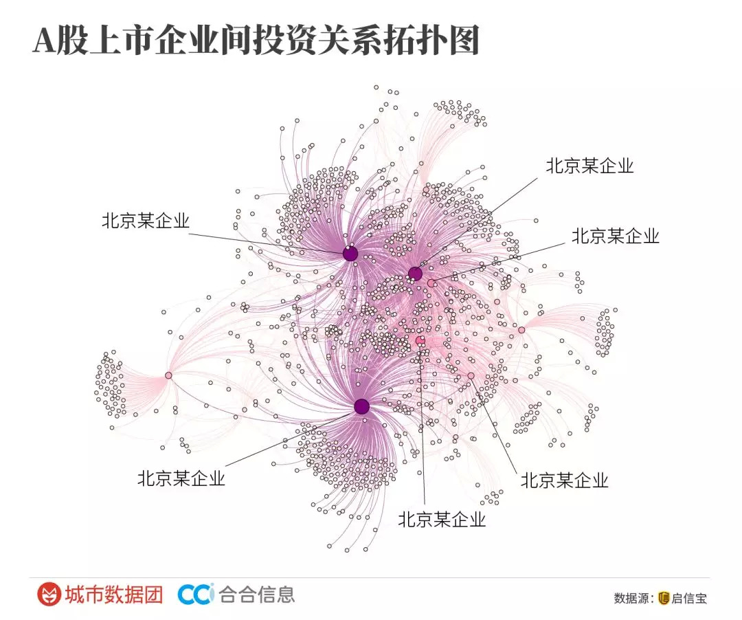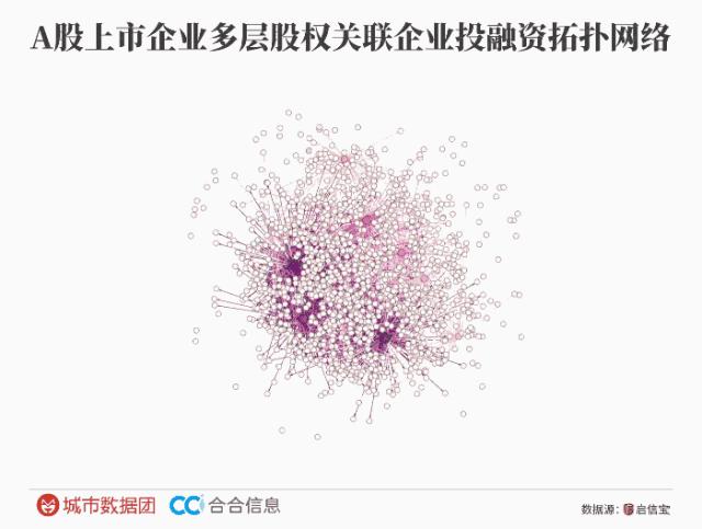 城市数据图和合合信息的数据还以3500多家A股上市企业为种子,检索了六层股东(包括上市公司的股东、股东的股东等)、六层投资(包括上市公司的持股公司、持股公司的持股公司等),从而构建出了大约涉及30多万家有股权关联的机构网络(排除了所有相关的个人股东)。