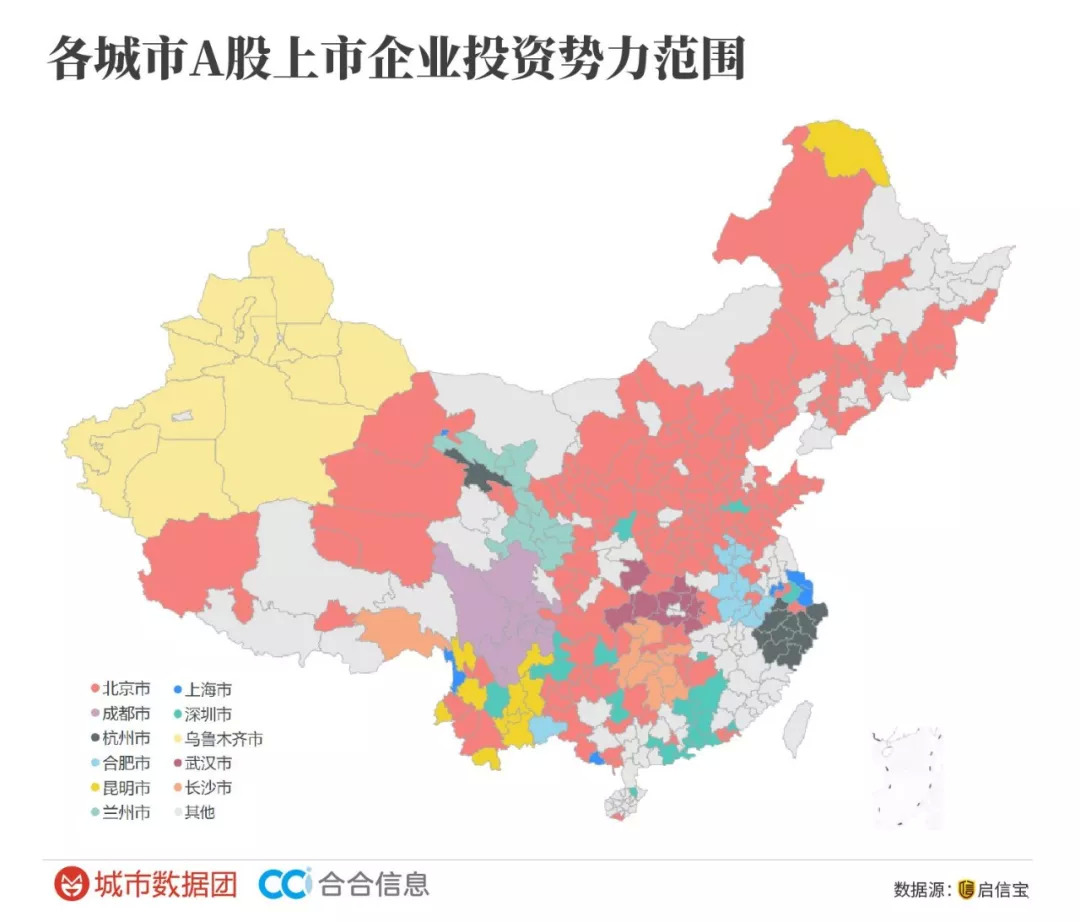 从对外投资辐射看,北京更是绝对的王者,其势力范围覆盖了156个地级市,占全国城市总数的一半,真的是半壁江山啊。(计算标准说明:每个城市获得哪个城市上市公司投资的企业越多,就归属于哪个城市的势力范围)