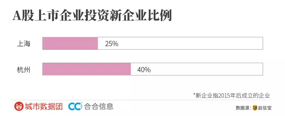 另外,杭州对于新企业、新产业的投资布局积极性较高。沪杭上市企业投资的新企业数量(成立于2015年及以后的企业)占全部持股企业数量的比例,杭州以40%完胜上海的25%。甚至,杭州的这个数据高居全国第一。