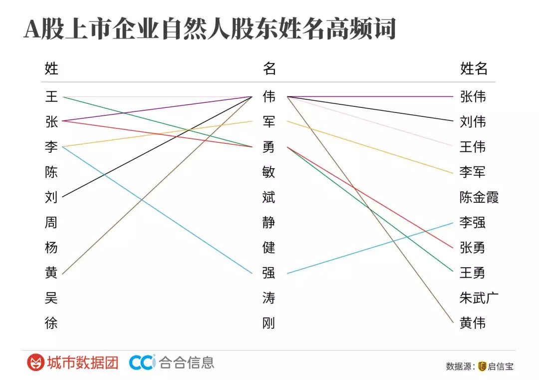 而对所有上市公司六层自然人股东的姓名词频也做了统计,有意思的发现是:第一,TOP10姓氏中,“赵家人”居然全面隐身;第二,名字方面,“伟哥”不负众望,冠绝A股。所以,如果你的名字是下列这些的话,你就是传说中的。。。