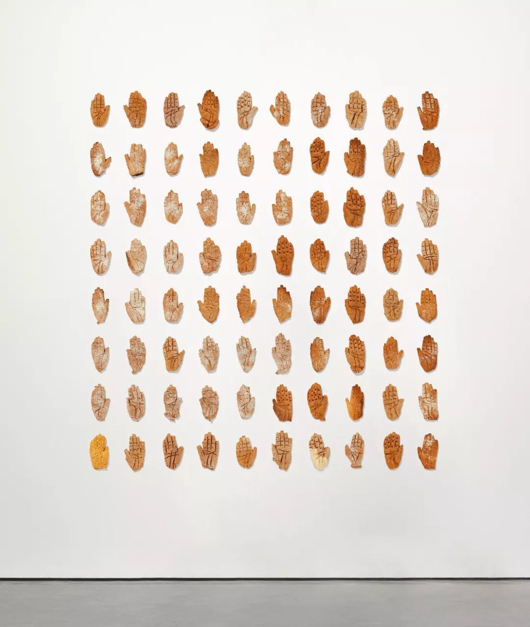 看过布鲁诺·瓦尔波特的作品后,可移步到三楼的另一个展厅,进入英国艺术家马克·奎恩营造的以科学、人体、情感为主题的感官世界。马克·奎恩毕业于剑桥大学艺术史专业。在策展人王春辰看来,马克·奎恩是一位生命直觉型艺术家。走进展厅你就会发现,他的作品很难用绘画、雕塑、多媒体这些常见的艺术门类来框定,而是充满了古灵精怪的创意和打破各种边界的野心。比如2002年创作的作品《做种,我是完美的》就是由艺术家体内提取的碳元素制成的一颗1.2克拉的黄钻。而作品《歧路之园》则是由面包制成的造型各异的人手。