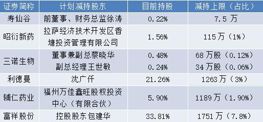 本周寿仙谷(603896.SH)、昭衍新药(603127.SH)、三诺生物(300298.SZ)、利德曼(300289.SZ)、辅仁药业(600781.SH)、富祥股份(300497.SZ)等药企股东计划减持,其中富祥股份的控股股东包建华计划减持最多,上限近1751万股,占公司总股本的7.8%。