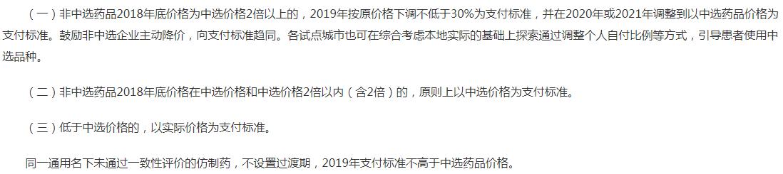 3月5日,国家医保局发布关于国家组织药品集中采购和使用试点医保配套措施的意见,明确将4+7集采中选价作为医保支付标准,提出对同一通用名下的原研药、参比制剂、通过一致性评价的仿制药,原则上以集中采购中选价作为该通用名药品的支付标准,医保基金按相同的支付标准进行结算。患者使用价格高于支付标准的药品,超出支付标准的部分由患者自付,支付标准以内部分由患者和医保按比例分担。