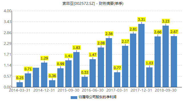 同比来看,营业收入虽有所增长,但索菲亚2018年第四季度归属于上市公司股东的净利润也出现单季度同比负增长。这是索菲亚上市以来第二次出现单季负增长,上次发生在2012年一季度。