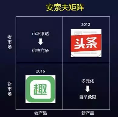 用一个战略分析工具安索夫矩阵,我们能更直观的了解到头条系和趣头条战略创新的本质。