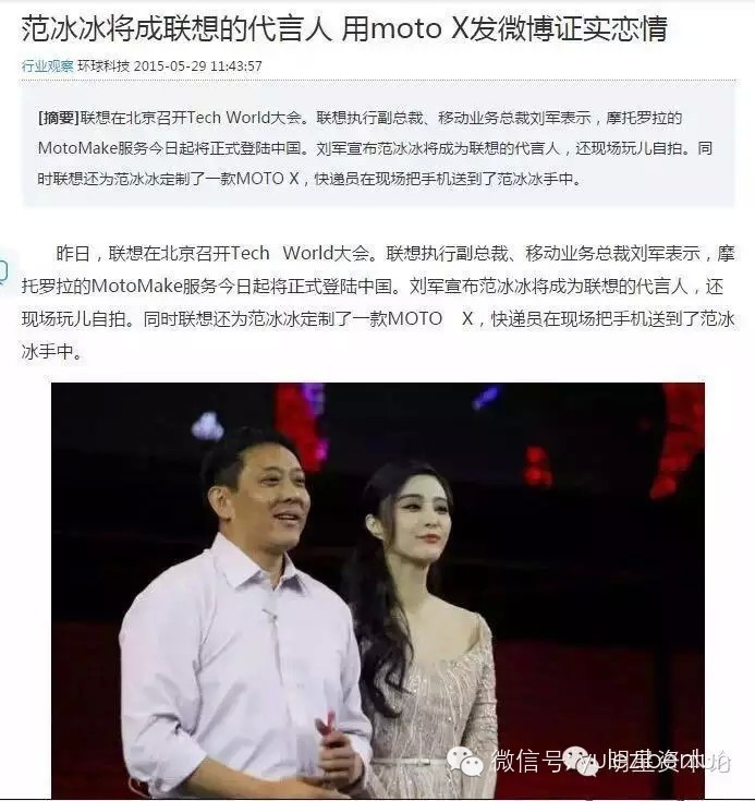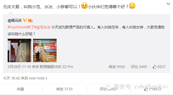 隔了不到半小时,范冰冰又马上选择在新浪微博公开。大家注意到了,微博发布使用的手机是Moto X,是联想旗下的品牌,而昨天范冰冰才公布与联想合作,今天就用联想手机公开恋情,还发了条和@杨元庆互动的微博,满满的都是商业的气息。