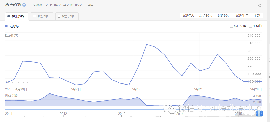 (从百度指数看,范冰冰几乎每半个月就要上一次“头条”,做她的宣传真得累死!)
